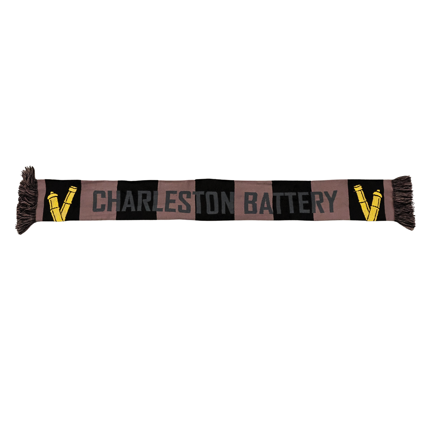 Knit Charleston Battery scarf with metallic thread details. Bold grey and black stripes with metallic gold thread center crest and iconic cannons.