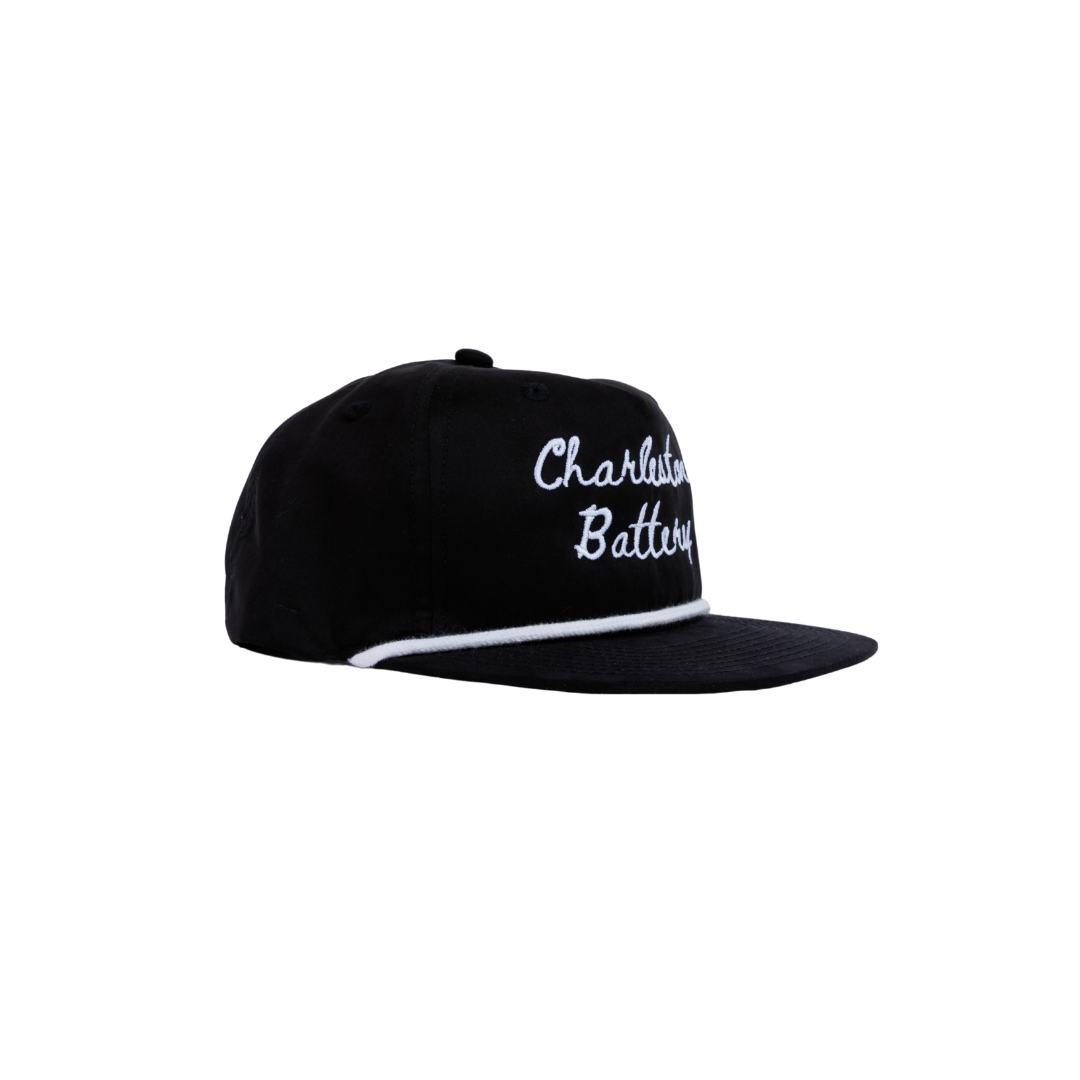 Design: Classic black hat with black Charleston Battery script embroidery and a white rope accent.